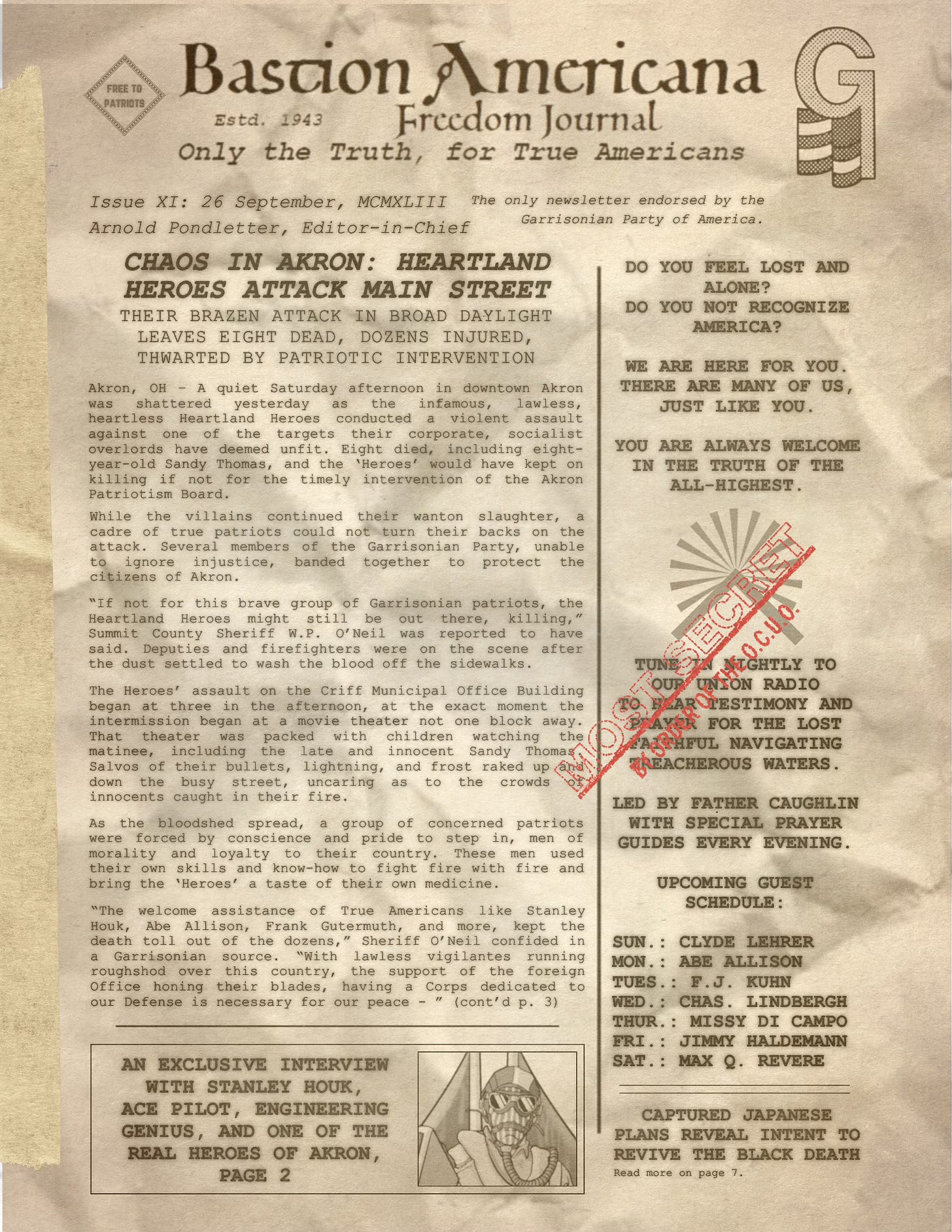 Despite the debacle having just happened the day before, the Bastion Americana Freedom Journal was able to rush a story about the Heartland Heroes’ attack in Akron to press within hours and still secure national distribution through their networks. Officials have yet to determine how they propagate information so quickly, but there is a solid suspicion that the writers behind the Journal knew exactly what was going to happen in Ohio before the Heroes ever showed up.