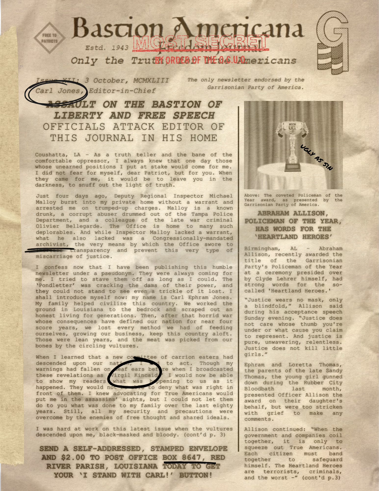 This edition of the Bastion Americana Freedom Journal is over fifty percent longer than previous releases. In addition to its usual tripe, it features essays by every prominent Garrisonian figure characterizing the Office as a secret foreign police force and an enemy of free thought and free speech. Several elected politicians also provided their first published comments in support of the Journal and the Garrisonian Party. Whatever goodwill the Office had left in the public eye was washed away in the wake of the Rubber City Bloodbath and Carl Jones’ arrest and release.